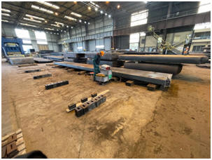 Bild 12.A – Ansicht der zahlreichen Platten in der Grosshalle. In dieser Abbildung sehen Sie die Grosshalle mit zahlreichen Platten, die abwechselnd auf der Hallenablagefläche mit dem MEMV-Verfahren entspannt werden. Dieses Verfahren dient dazu, Spannungen in metallischen Bauteilen abzubauen und Verzüge zu minimieren.