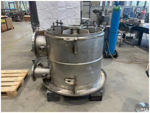 Bild 9.A – Aufspannung von rostfreien Leichtbau-Behältern zur MEMV-Entspannung, hier wird der Anreger mit der Automatischen Drehvorrichtung zur Entspannung von rostfreien Leichtbau-Behältern aufgespannt. Verwendet werden 4 Langaufspannstangen (40 x 70 x 1100 mm): 2 oben und 2 unten, 4 Briden (500 mm) unten sowie lange Gewindestangen. Eine gute Festklemmung ist entscheidend für optimale Resultate. Dabei ist Vorsicht geboten, die Gewindestangen nicht zu fest anzuziehen, da die Konstruktion ansonsten die Spannkraft von 4 x 17 Tonnen pro Gewindestange möglicherweise nicht aufnehmen kann.