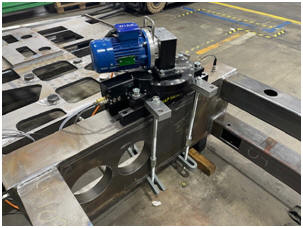 Bild 5.A – Aufspannung des Anregers an 2 neuen Bauteilen zusammengespannt. In dieser Abbildung wird der Anreger mit der Automatischen Drehvorrichtung an einem neuen Bauteil befestigt. Hierbei kommen Langaufspannstangen (40 x 70 x 1100 mm), Querlochseisen (40 x 70 x 550 mm), Gewindestangen und Briden zum Einsatz, um eine feste und sichere Verbindung zu gewährleisten.